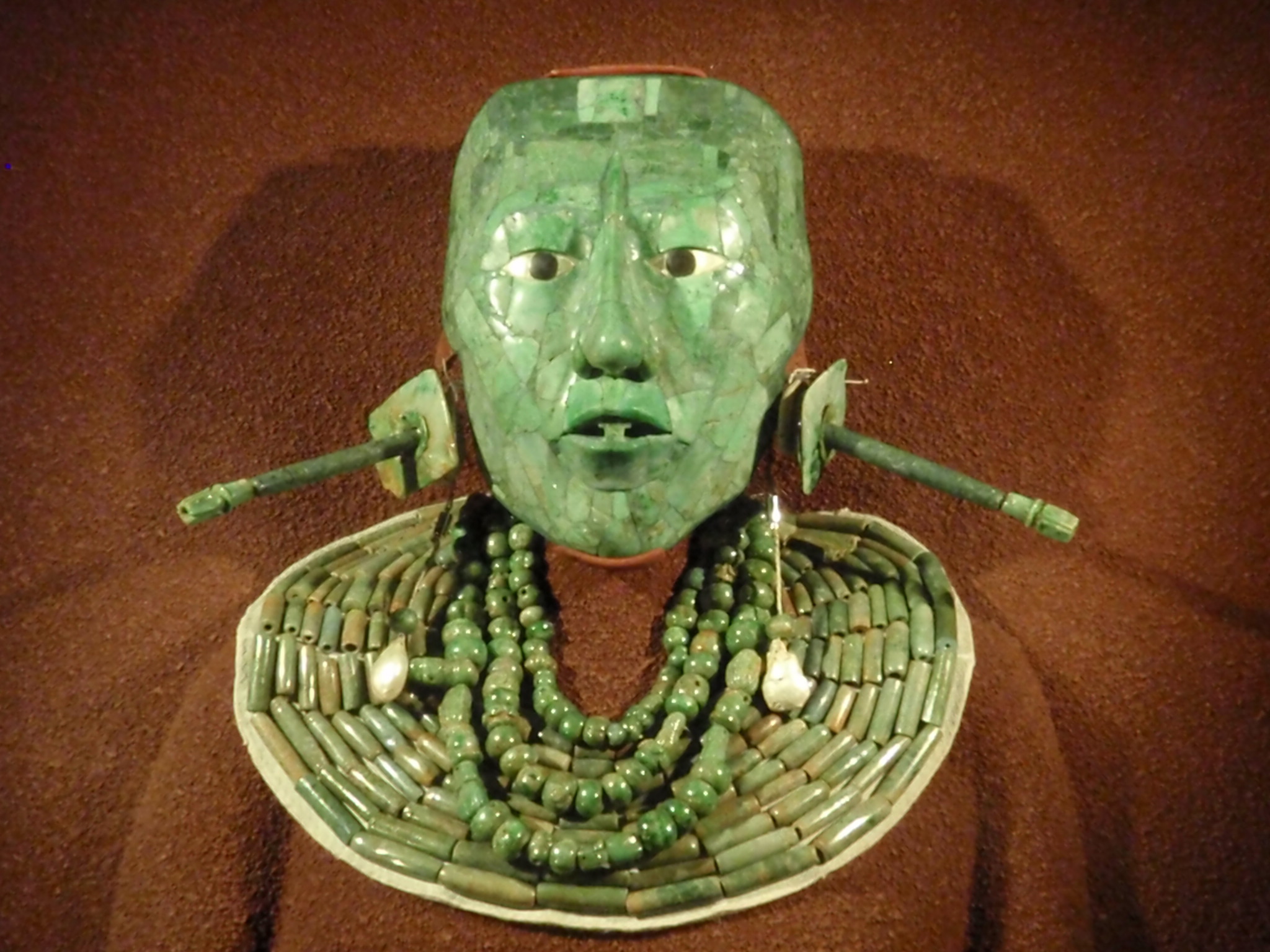 Pakal the Great’s sarcophagus was discovered in 1949 and it took until 1952 to fully unearth it. It holds the richest collection of jade seen in a Mayan tomb. Jade was very important to the Maya, as it represented Mother Earth, so Pakal was buried with many jade objects. His mortuary mask was encrusted with more than 200 tiny carved and polished jade stones, perfectly assembled and was purported to represent the Sun God.