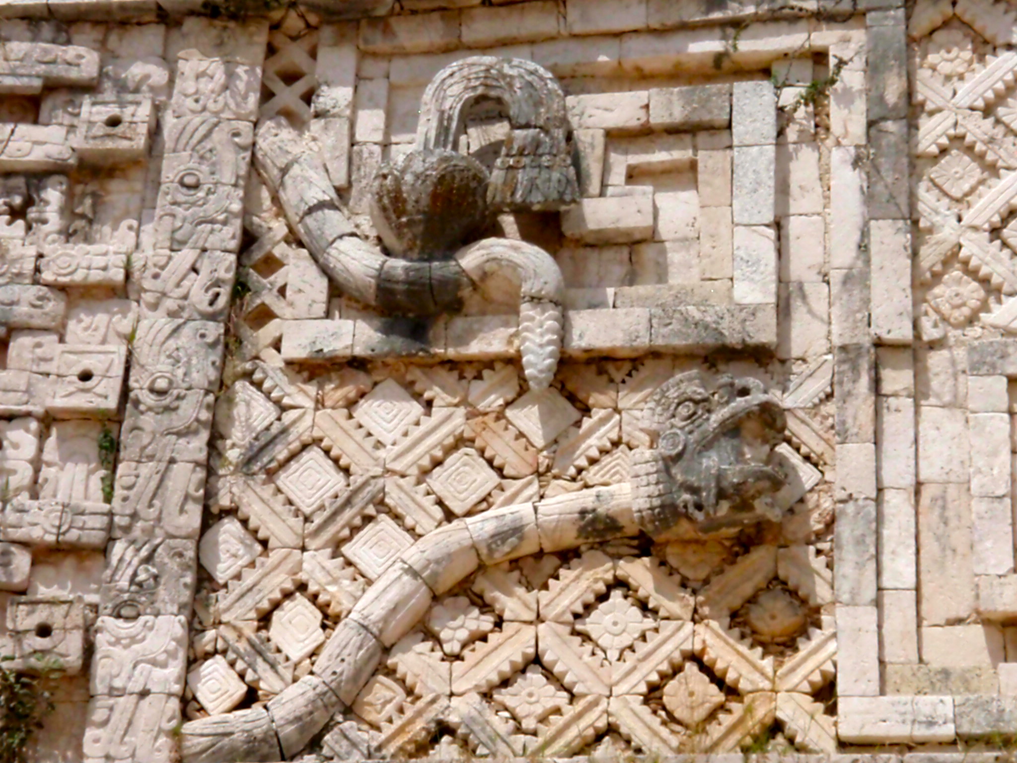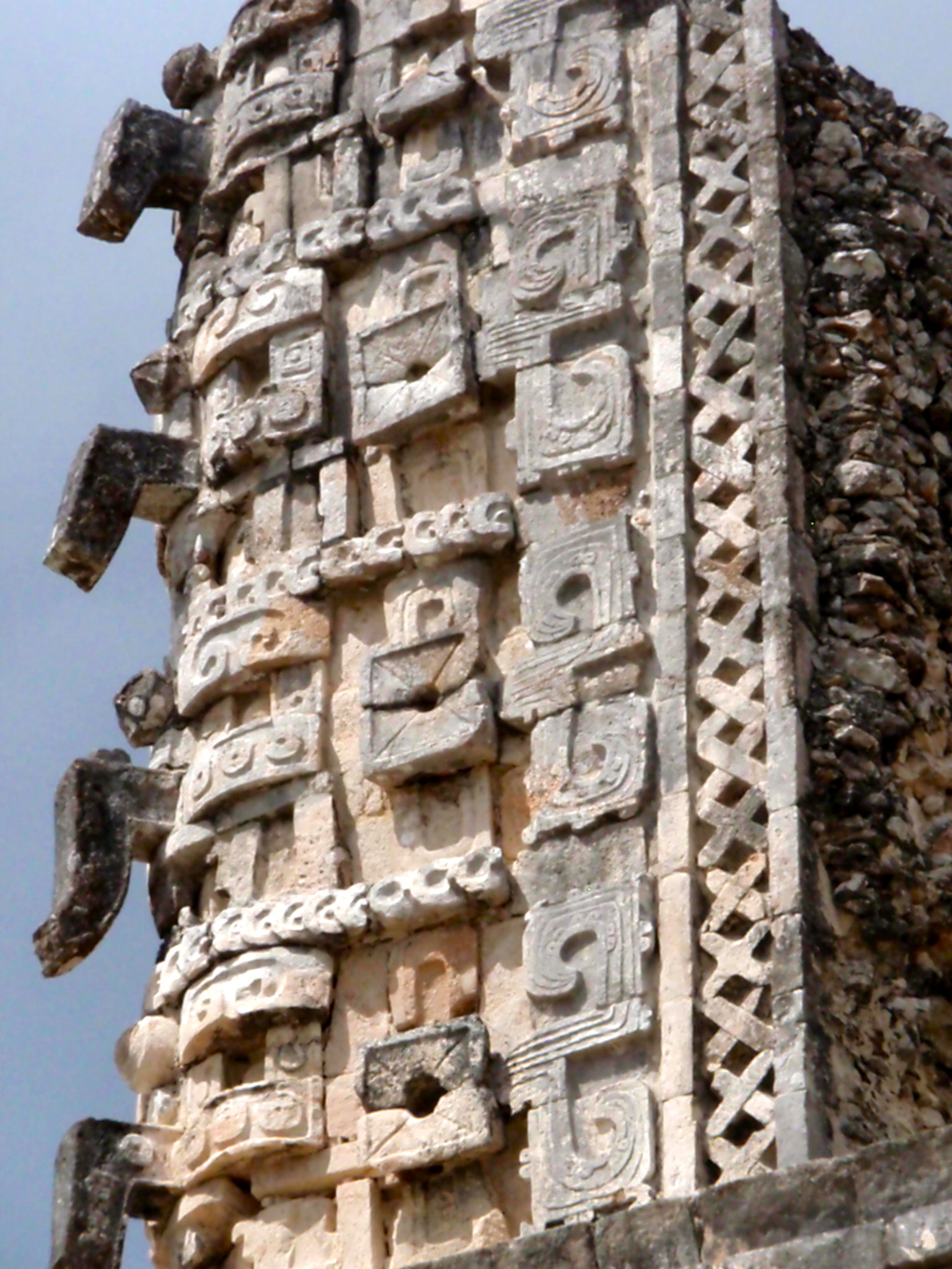 One of the buildings within this quadrangle depicted a plumed serpent on the top section, with feathers on his tail and his body woven around the latticework. A corner of another building was adorned with stacked faces of the rain god Chac.