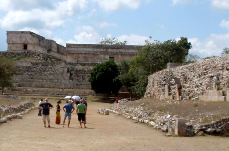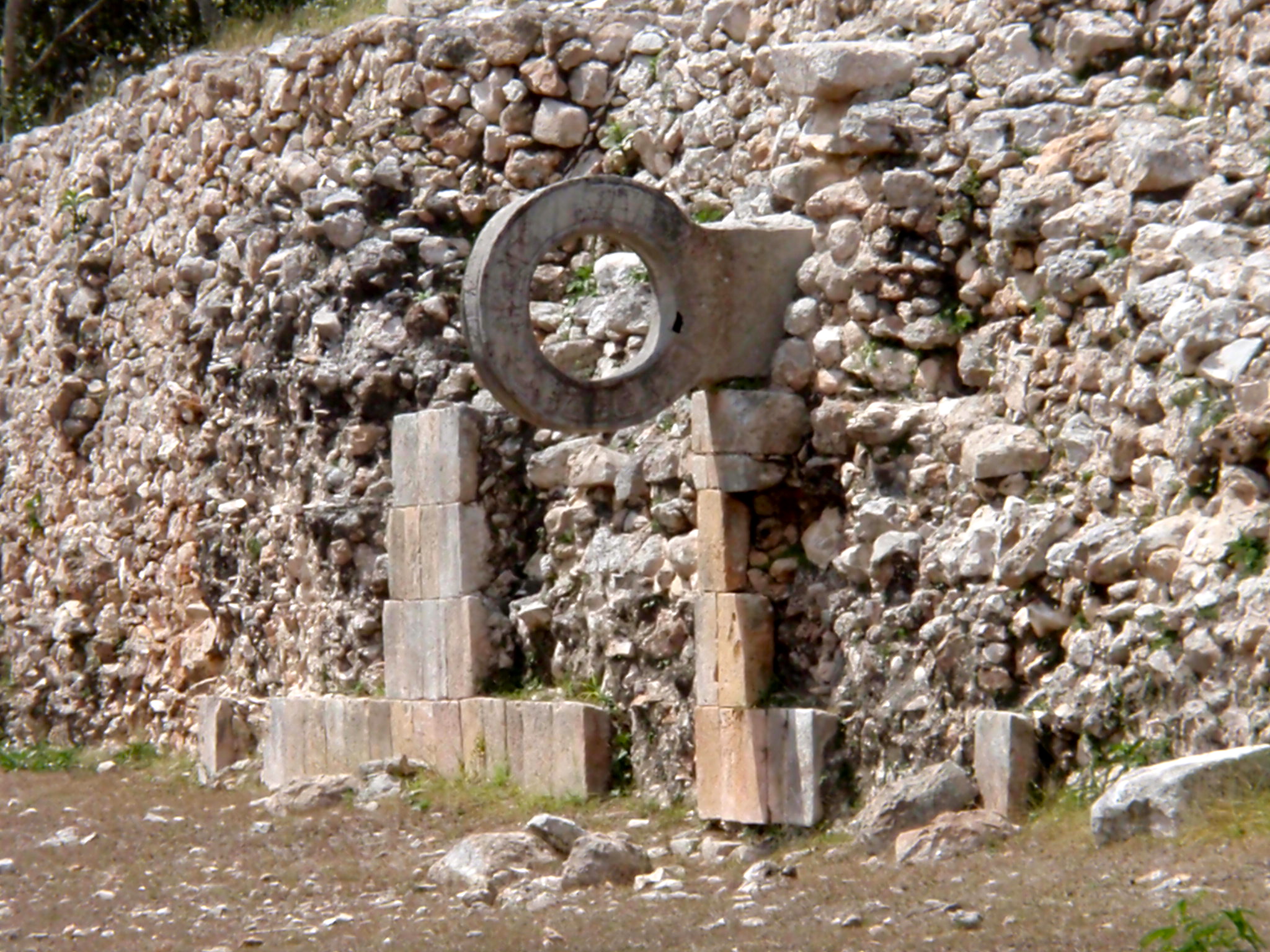 Virtually all Mayan cities contained a ball court and Uxmal is no exception. Two vertical walls within the ball court, opposite to one another, each reflected a large stone ring in the middle of the wall. The object of the game was to propel a hard, very heavy, rubber ball through the ring. This game was played somewhat like soccer, in that one could not use their hands. The ball could not be kicked either, but must be moved by way of the forearms, waist, or legs. The game held deep religious significance for the Maya and was played with seven priests on each side. When the ball was projected through the hoop, the priest responsible for this was offered up to the rain god Chac.