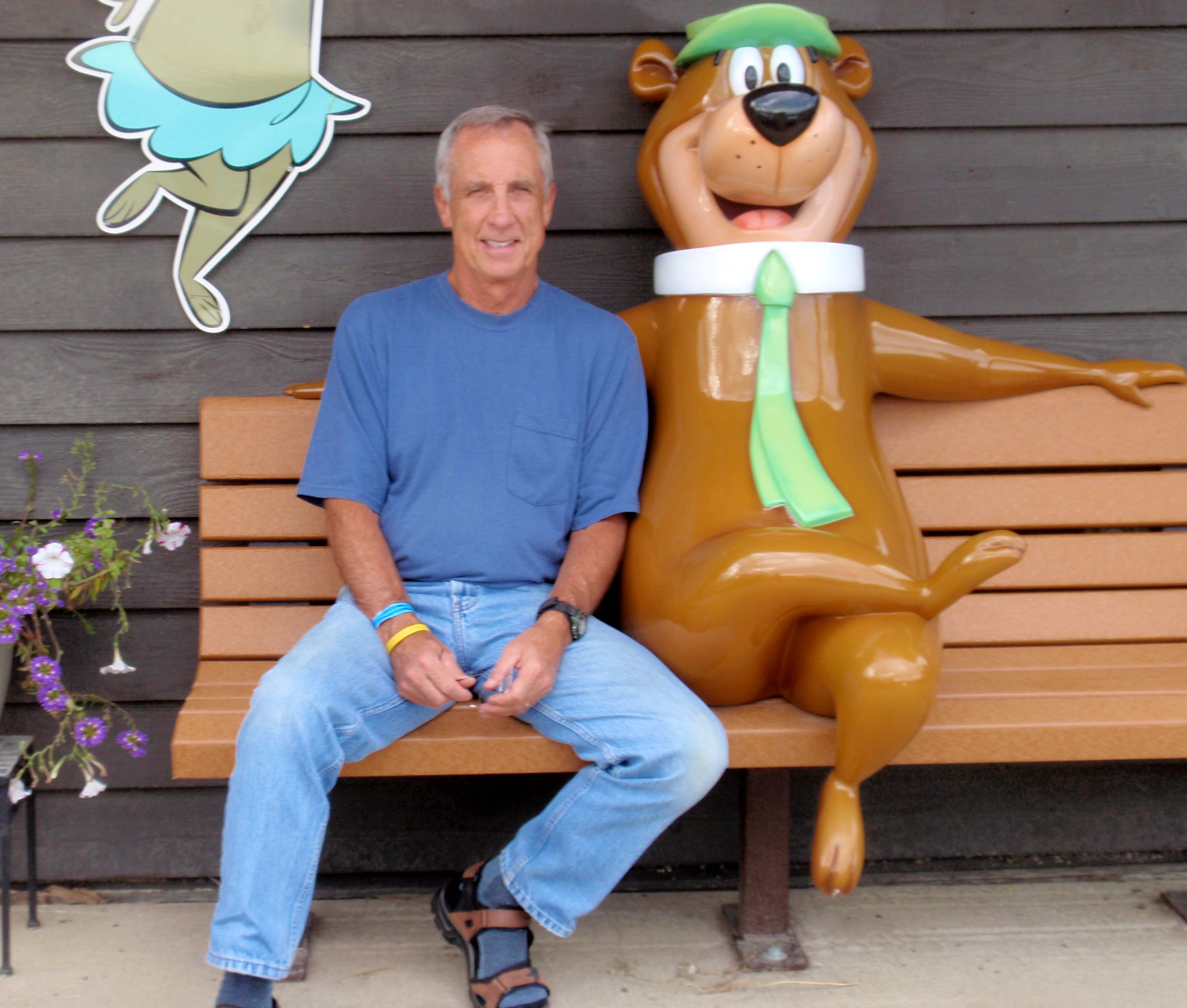 Jellystone, where even Yogi Bear has learned to reinvent himself. It appears the infamous bear, in what looks to be semi-retirement, is now making appearances at select campgrounds, surprising birthday boys and girls. Who woulda thought?! Our friend, David, was wondering where he might be so I thought I would take a picture of Terry with Yogi to authenticate his existence (Yogi’s that is, but I suppose it would be nice to see that Terry is still alive and kicking!)