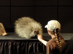 Running Wild is another program that has been presented for four years running at the desert museum and one that we were lucky to see. A screen presentation regarding the history of the park, now in its 60th year, was recounted by curator George Carpenter. At various times throughout this screening, background music was the cue for live animals to scamper or waddle onto the stage, while the curator described the habits of these animals and the conservation efforts that came into play to develop this Desert Museum. It was amazing to see a hooded skunk, ringtail, Gambel’s quail, brown pelican, and porcupine sashay on stage and exit on cue. We learned that it takes several months to train these animals to walk across the stage.