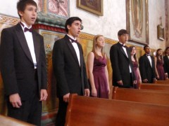 While walking through the cemetery we heard a spellbinding sound coming from the chapel.  We wondered aloud if it was coming from speakers or from a choral group, as we had seen young men and women dressed in evening wear on the steps of the church when we arrived.  When we poked our heads inside, lo and behold, it was the latter and we were allowed to watch, along with a handful of others already in attendance.  Lined along both sides of the chapel walls were these same young men and women, the San Marcos High School Madrigals Chamber Choir, with their director, Carolyn Teraoka-Brady, in the center aisle leading them.