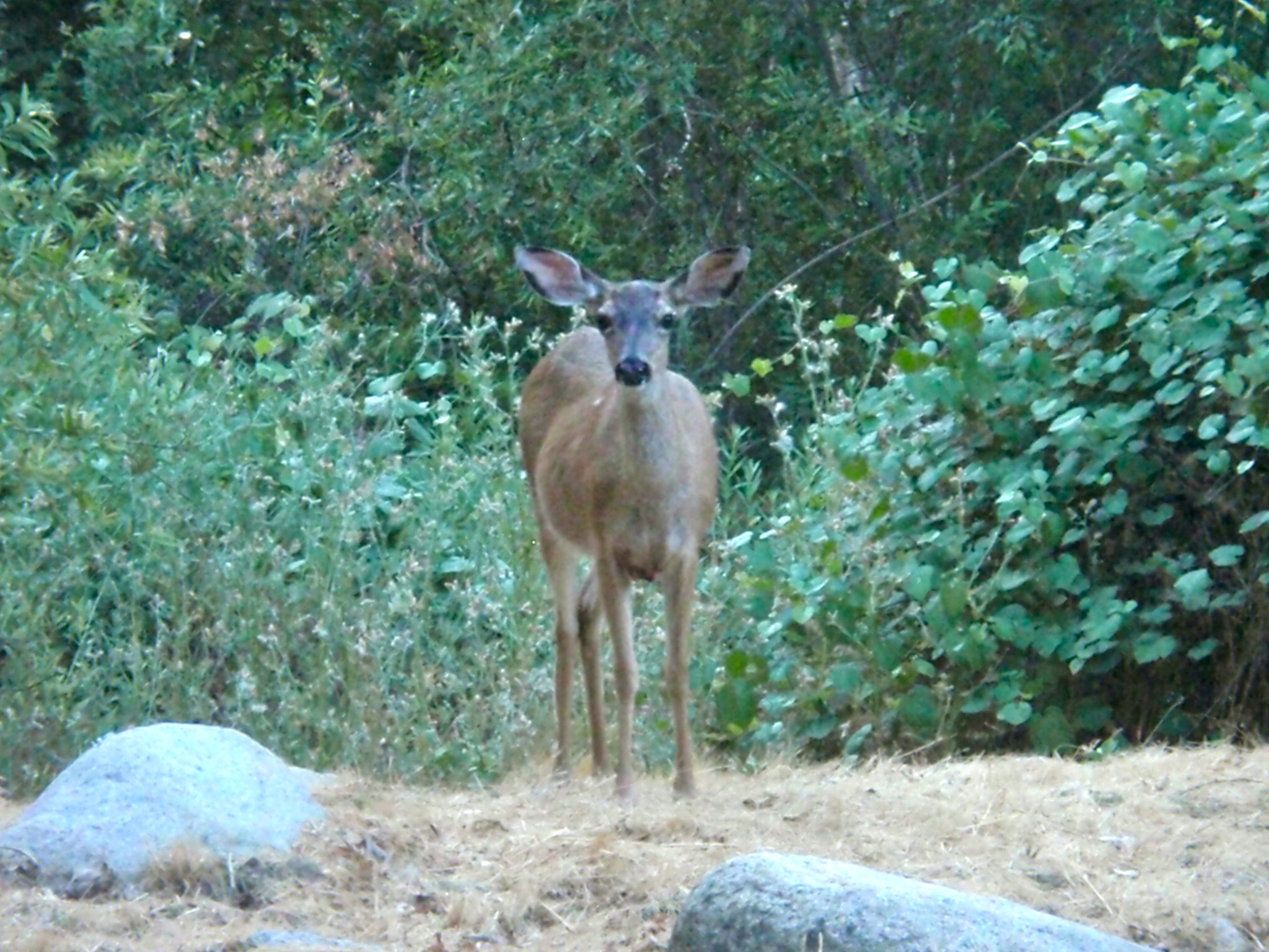 • Hi David, Yep, Terry certainly looks like he is having a tough time, doesn’t he? I think the ears are the reason for the name of the deer. We will be kicking back here until the 13th, which is when we will be heading to Yosemite and will stay there for a couple of weeks. Yosemite is near the redwoods and is about 125 miles north of here. This campground and the two National Parks near Three Rivers are really pretty amazing. Hope all is well with you and Les. Love you both!