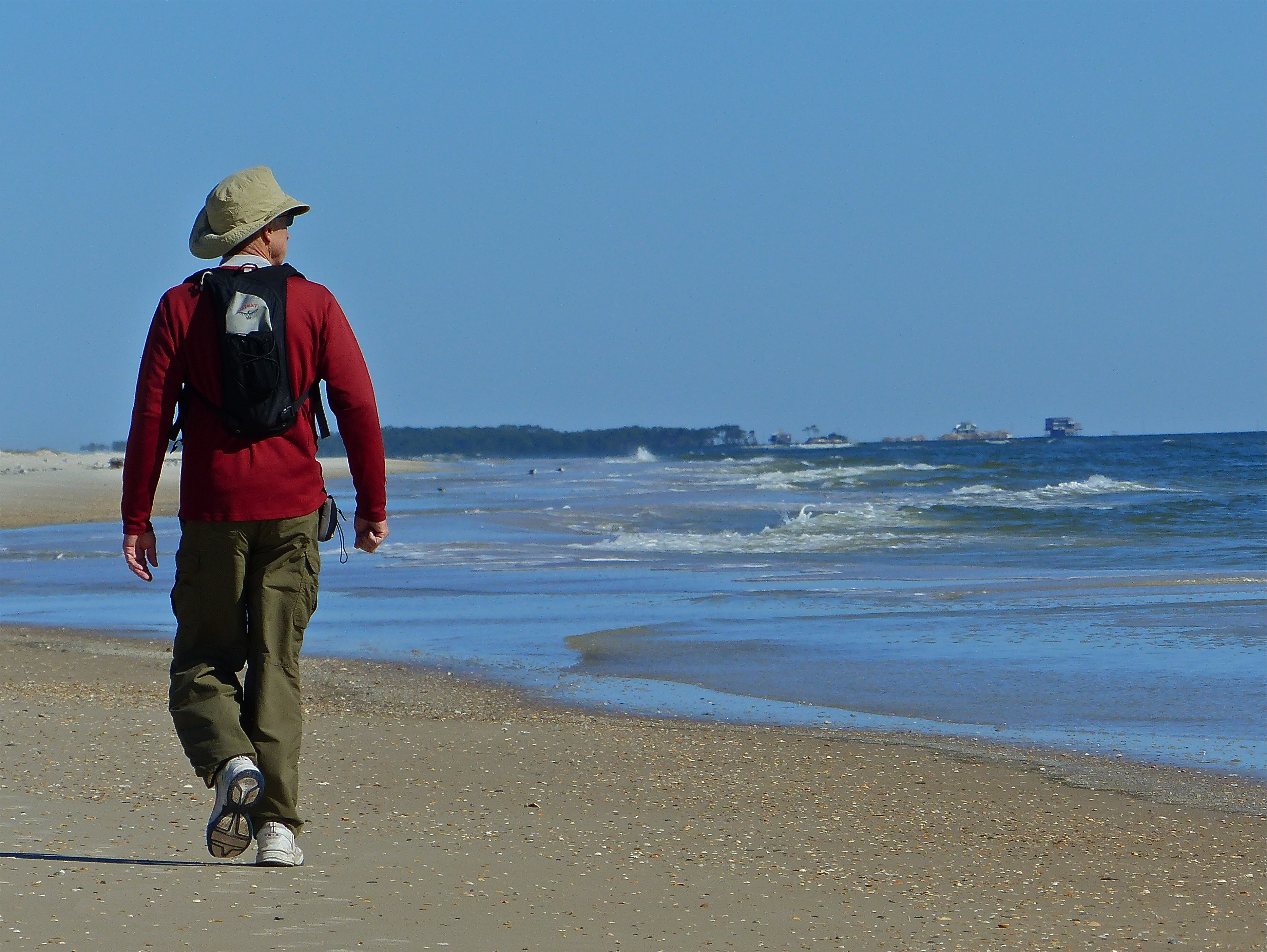 St. George Island State Park occupies the far eastern end of the island, with 9 miles of sugary white-sand beach and dunes to explore.  Stretching our legs on the beach, a brisk wind in our faces, and lungs deeply filled with salty sea air was just the ticket to shake off the cloak of lethargy after several rainy days.  If you long for some solitude, a symphony of wind and surf, with visions of a lovely little pond and a majestic heron hanging out in the surrounding trees, this could be the place to settle for a few weeks.