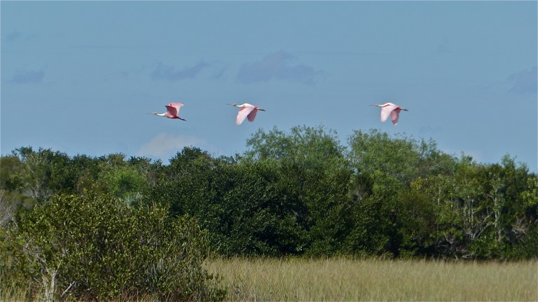 • I found it interesting biking in Shark Valley that we were cautioned to stay 15 feet away from the alligators, but the bike path is only 10 feet wide, and the gators would sometimes be halfway across the path…I felt more comfortable if the gators were facing AWAY from me. Loved your roseate spoonbills in flight, and your photos of your pole boat excursion. I want to do that!