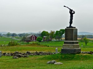Statue of soldier swinging his weapon, looking out over the meadow known as “Pickett’s Charge”, the “high water mark” of the three day battle.
