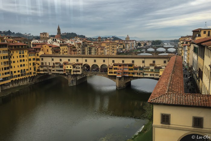 From a window in the Uffizi Gallery you get your best views of the Arno River, second only to the Tiber River in importance in the Tuscany area.  Spanning the narrowest part of the river, the Ponte Vecchio can be seen, Florence’s most famous bridge, lined with shops since Roman times.