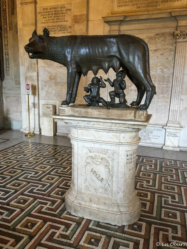The Etruscan Lupa capitolina is one of the most famous statues here.  It is the original bronze She-Wolf, a wild animal coupled with two hungry babies, Romulus and twin brother Remus.  According to Roman mythology, these two babes, children of Rhea Silvia and Mars, were credited with being the founders of Rome. They were orphaned as infants and raised by a she-wolf on top of Palatine Hill, one of Rome’s seven hills, overlooking the Forum.  It is a powerful symbol of perseverance for the city of Rome.