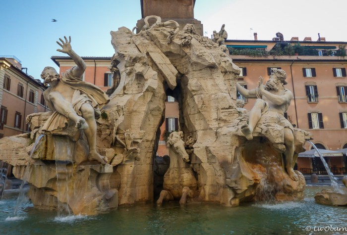The main attraction at this piazza is the Four Rivers Fountain.  The pope, looking to clean up some of the seedier Rome neighborhoods, commissioned Bernini to build this fountain, with an obelisk rising from the center.  It represents gods of the four great rivers in four continents – the Nile in Africa, the Ganges in Asia, the Danube in Europe and the Río de la Plata, separating Uruguay and Argentina.