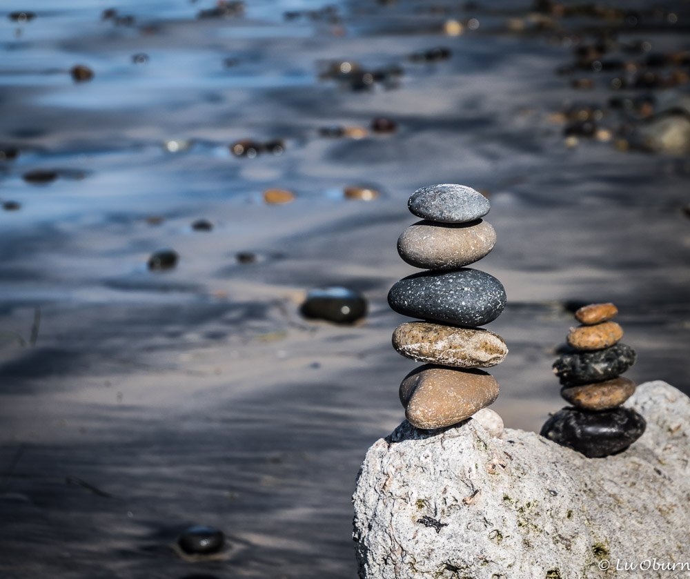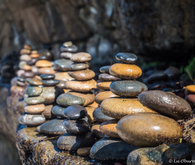 Love your photographs of the seagulls in particular the one of them caught in flight. Fabulous. Also love the stacked pebbles and your description of them being washed in and out by the waves….