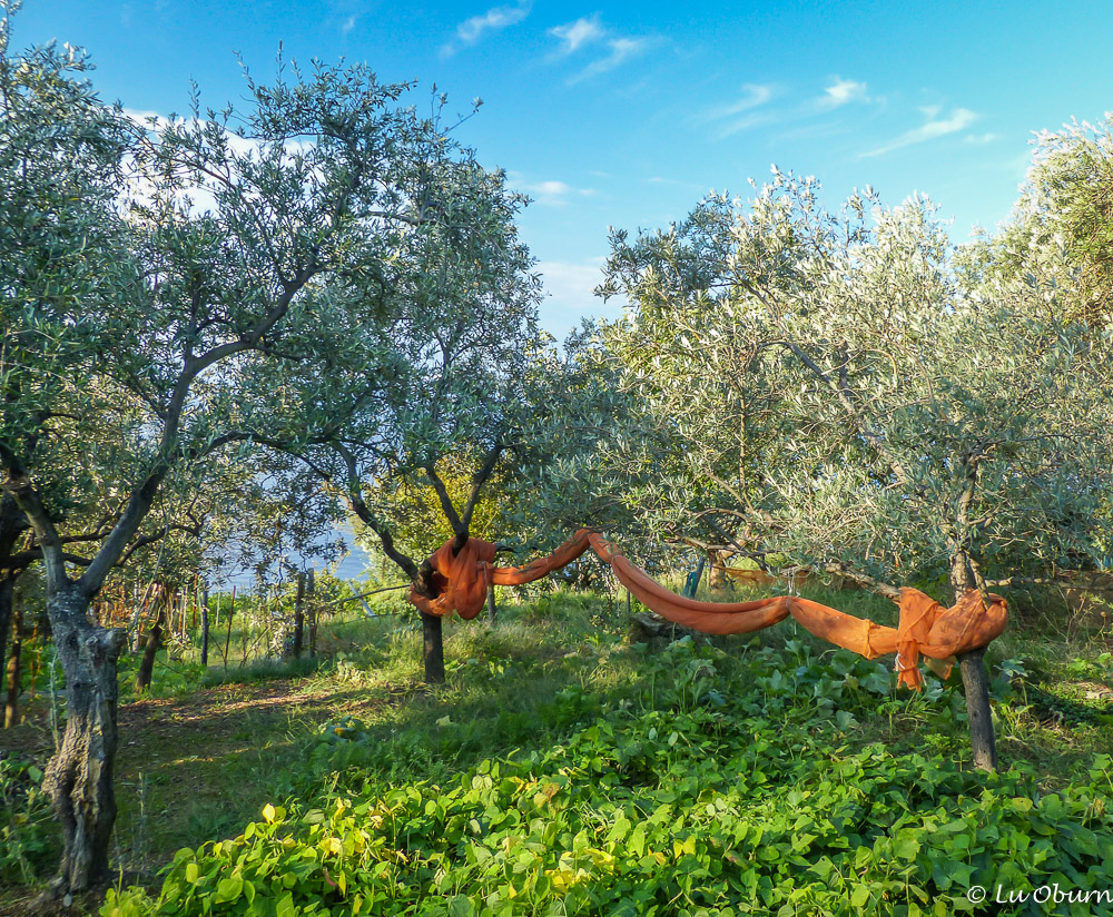 Nets tied up under olive groves awaiting a new harvest.