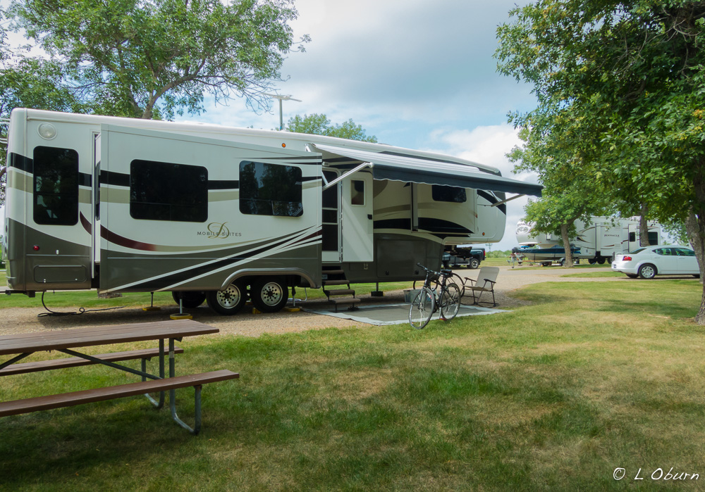 Our visit has been more rain than sun and locals say this part of ND has had a very wet summer. On one of those cloud-filled mornings I headed out bright and early, hoping to get a hike in before the rains came. My goal was to tackle part of the Maah Daah Hey, a trail that stretches 97 miles across the National Grassland, connecting all three units of the park. Over 7 miles of it runs through the South Unit, just a couple of miles from our campground and it’s a great trail for hiking and mountain biking. Plans were thwarted when I got to the Little Missouri, a necessary water crossing I thought would be easy. Given the recent rains we have had, no way was the river allowing me passage. 😦