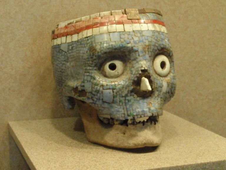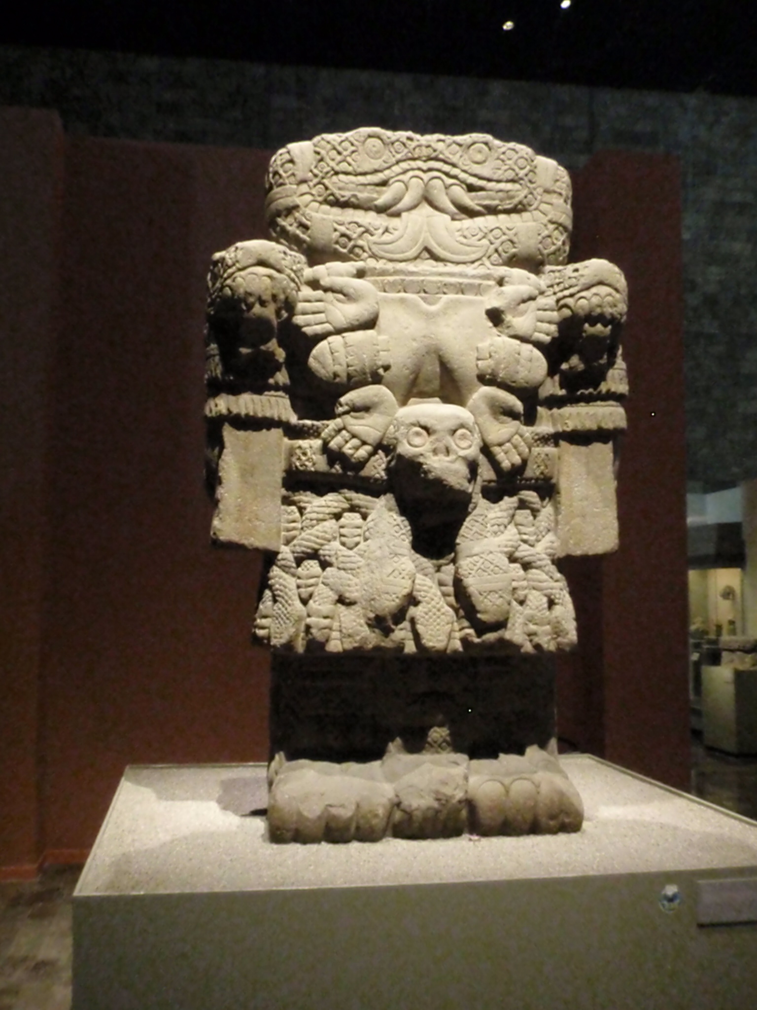 Above is a statue of Coatlicue, the earth goddess of Aztec mythology. She is the mother of sun, moon, stars, and all the Aztec gods and goddesses. Her name means “serpent skirt”. It is said that she is the source of all life on earth and took the dead back again into her body. This statue depicts Coatlicue as both creator and destroyer.