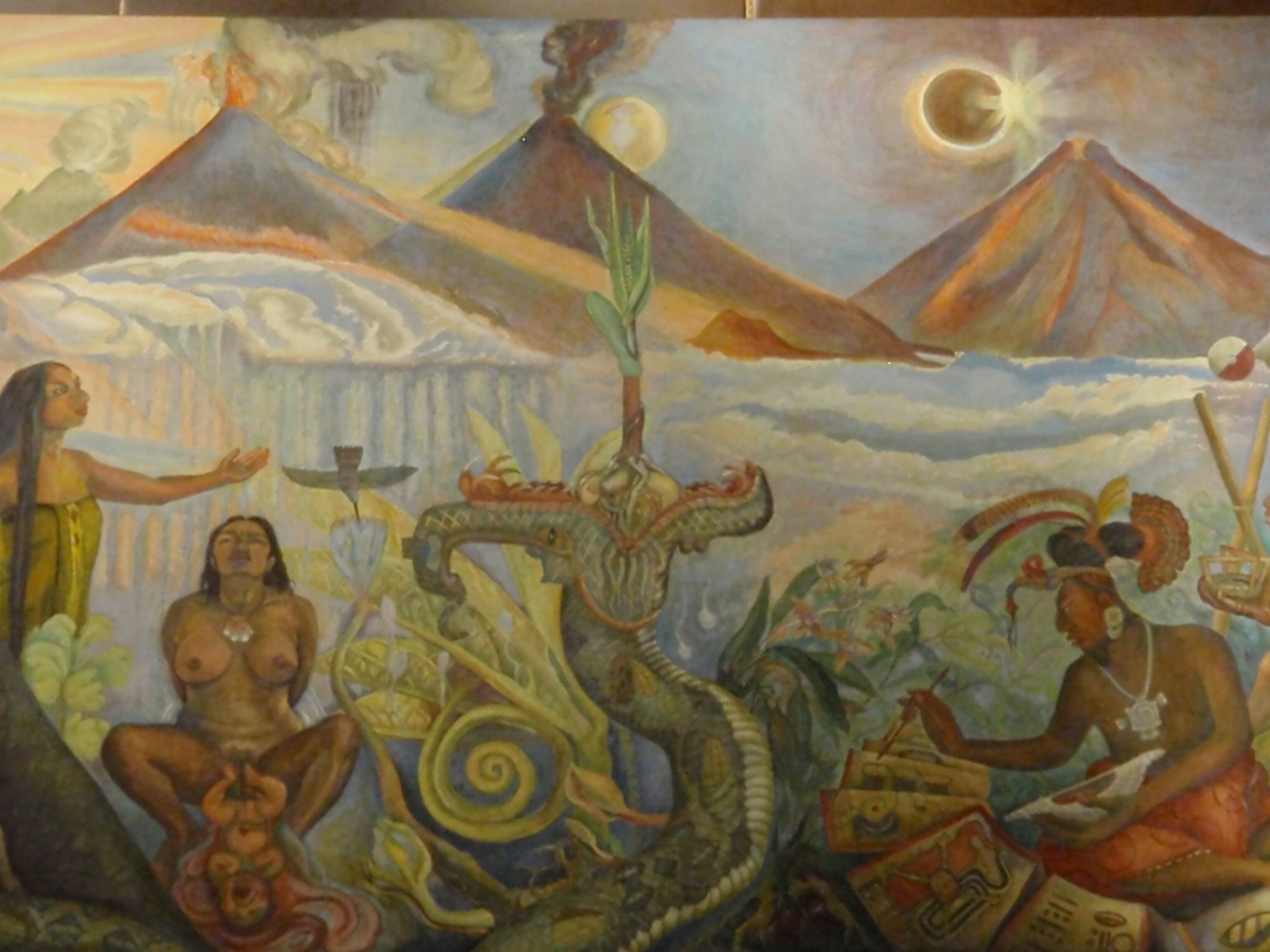 This beautiful mural was covering one wall of the exhibit room. Notice the birthing process, along with the serpent with mouth open, representing entry into the underworlds.