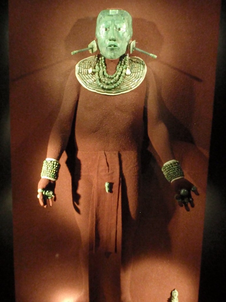 These are the funerary effects of Pakal the Great, the Great Mayan King who reigned over the inhabitants of Palenque. His actual sarcophagus is located in the Tomb of the Inscriptions at Palenque, which he had built during his reign. For the Mayan people, existence after death took place in a parallel universe reproducing the conditions of earthly existence, so they regarded it with the same importance as life itself. Jade was very important to them, so Pakal was buried with many jade objects. His mortuary mask was encrusted with more than 200 tiny carved and polished jade stones, perfectly assembled.