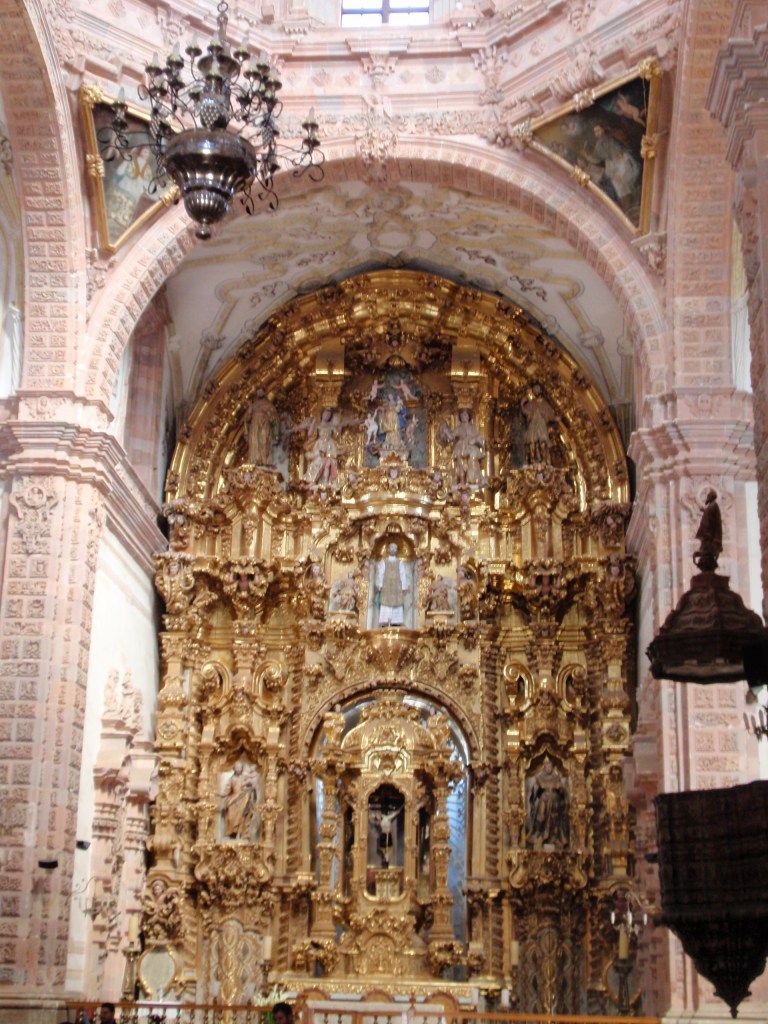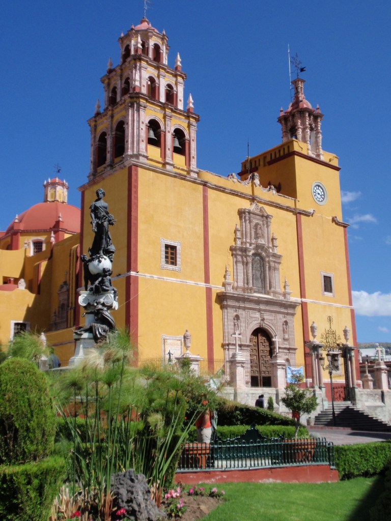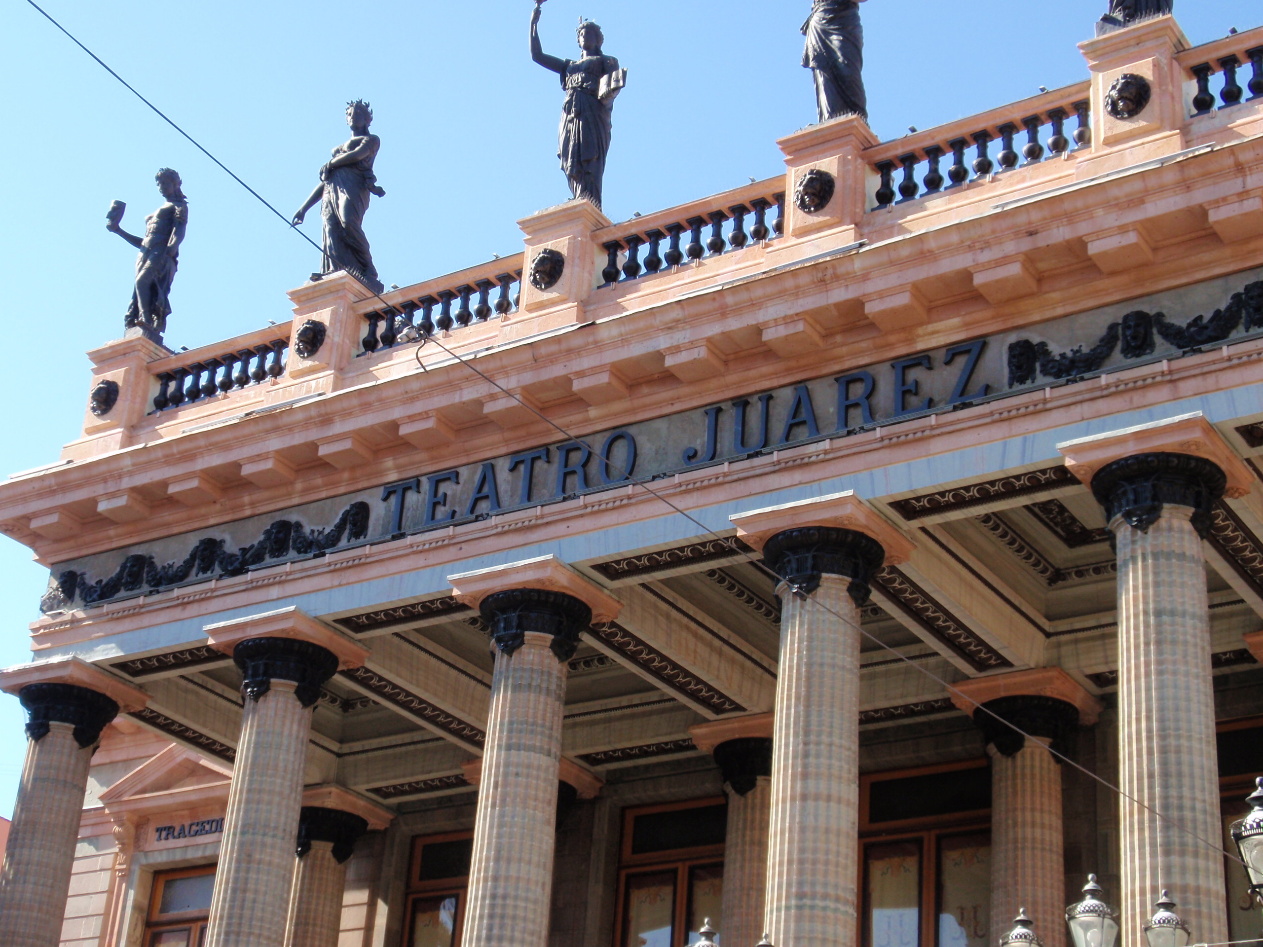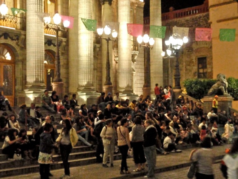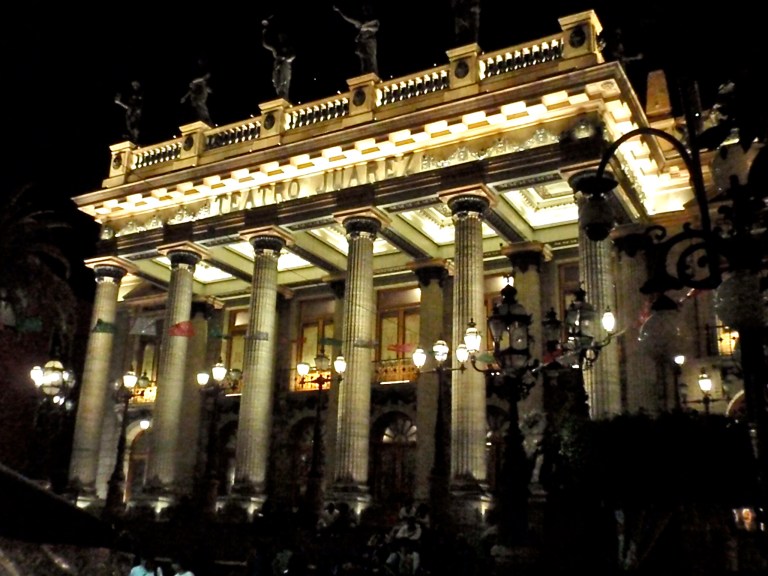 One of the most beautiful theaters in all of Mexico resides in the heart of Guanajuato, across from the Jardin de la Union, the Teatro Juarez. The bronze sculptures of the Greek muses are proudly displayed on pedestals atop the theater and are breathtaking, both during the day and at night. The inauguration of this theater occurred in October 1903 and can accommodate 1100 spectators. It is the main stage for the annual International Cervantino Festival, as well as the focal point for theater, ballet, musical presentations, and painting and photography exhibitions. On nights when there are no performances being held, impromptu mime acts and other student productions are taking place outside, with the stairs leading up to the theater packed with students and other observers.