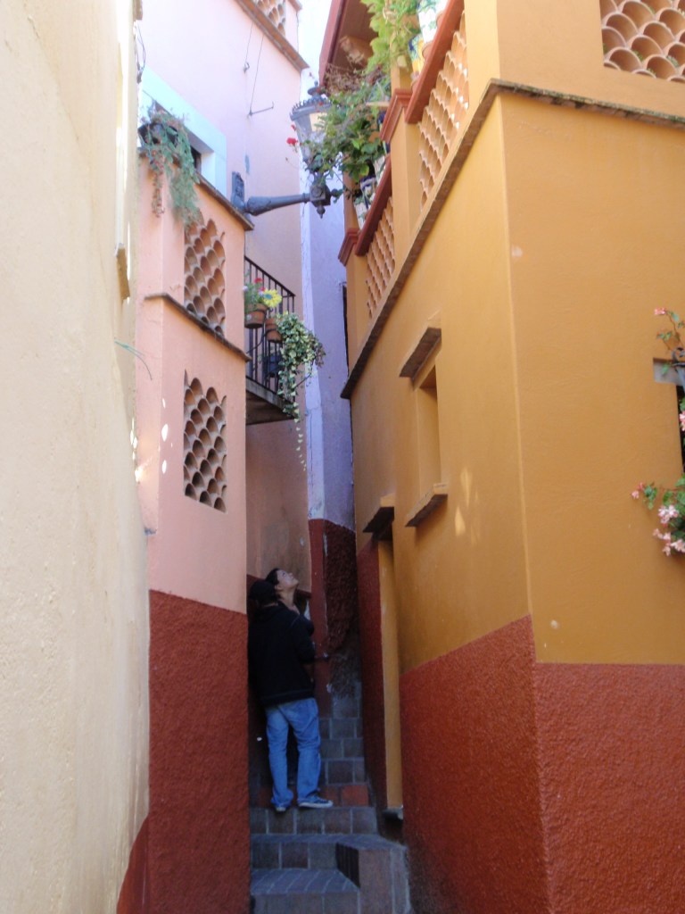 There is a famous alleyway not to be missed when in Guanajuato, that of the Callejon del Beso (the Kiss Alley). Legend has it that two young lovers, one a wealthy Spanish girl, Ana, and the other a poor miner, Carlo, would sneak kisses from their balconies across from one another. One night Ana’s father witnessed this and murdered his daughter. Carlos was so distraught over his loss that he killed himself in one of the local mines.
