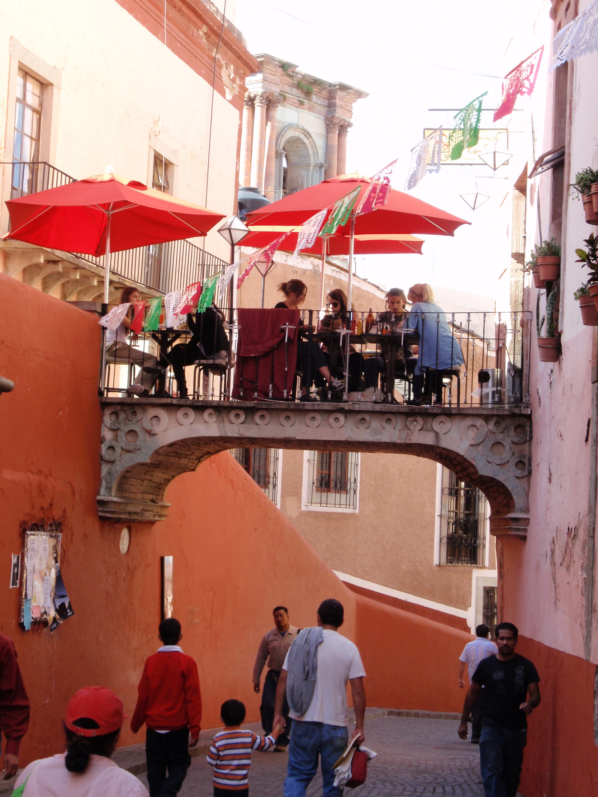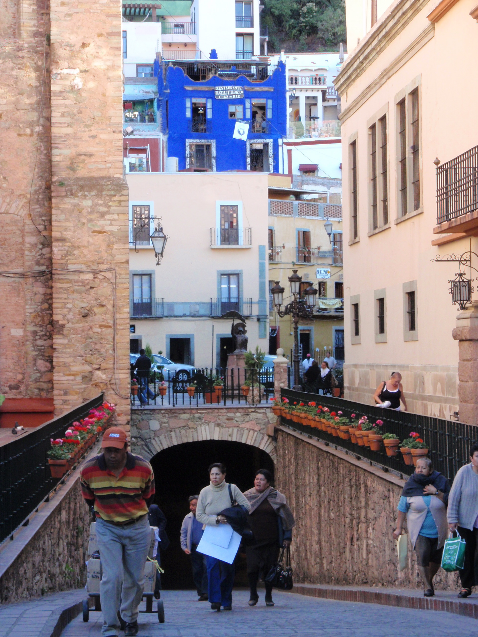 Just a few steps away is Campanero (Bellman) Street. Looking skyward, you will see an 18th-century bridge, one of the few remaining in Guanajuato, with a lovely cafe spanning it.