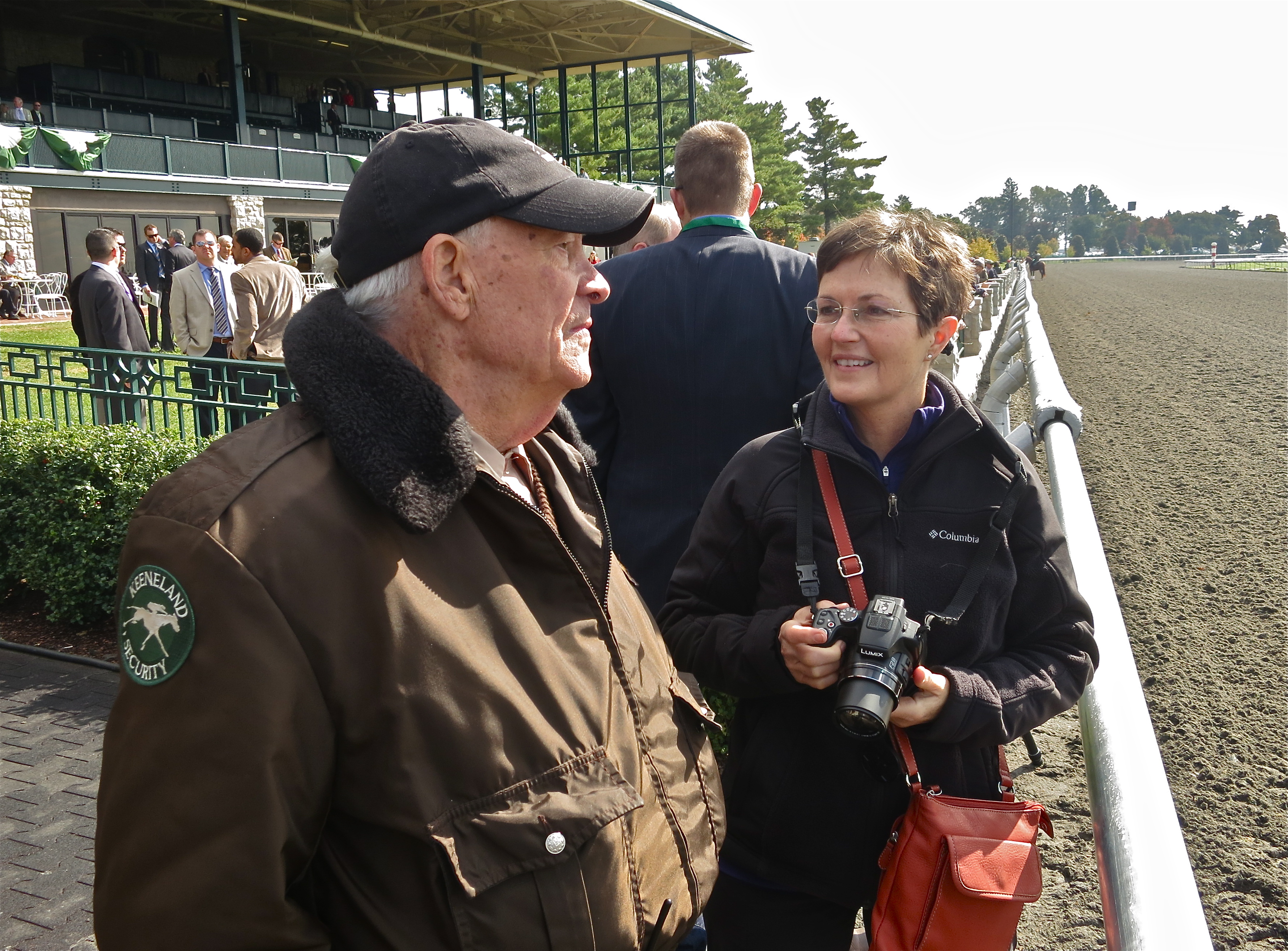We arrived at the track early to explore the property, in the hopes of seeing some horses being prepped for the big race day. The surprise of the day was encountering Tom, one of Terry’s fellow high school football players, who worked at the track. He generously allowed us into the inner track, giving us the opportunity to watch the race from the rail, up-close and personal, right next to the winner’s circle (be still my heart). Our escort was a warm, engaging man of 86, Jim “JR”, who has volunteered at Keeneland for 20 years, and is quite the ladies’ man I soon learned.