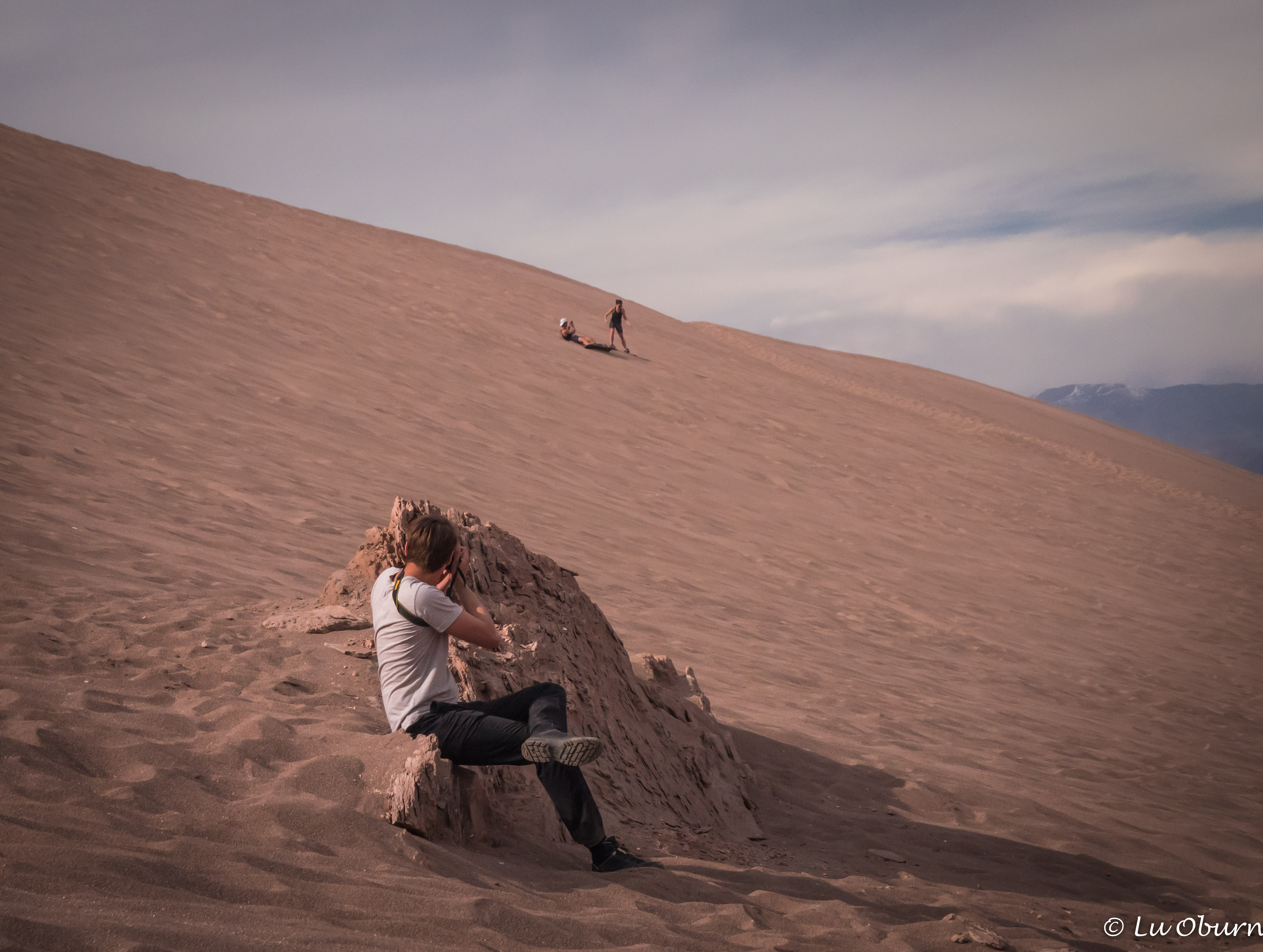 Our final hike was up to a vantage point overlooking a ridge skirted in dunes, with the Amphitheatre as a backdrop. This is where one hopes to get the iconic shot of the moon rising over the Atacama, as well as a sunset shot bursting with color. We were not confident of either as clouds had chased us all day, with rain a possibility, a most unusual occurrence in this land devoid of moisture. We saw neither the moon nor an enchanting sunset, but still labeled this a magical day.