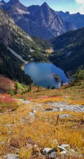 The views are drop-dead gorgeous, with low clouds draping the mountains, stunning views of glaciers from just above the pass, glacier-kissed mountain lakes, and brilliant fall colors that took my breath away. Well, maybe the 7.5 miles and 2100’ elevation gain had a bit to do with that.