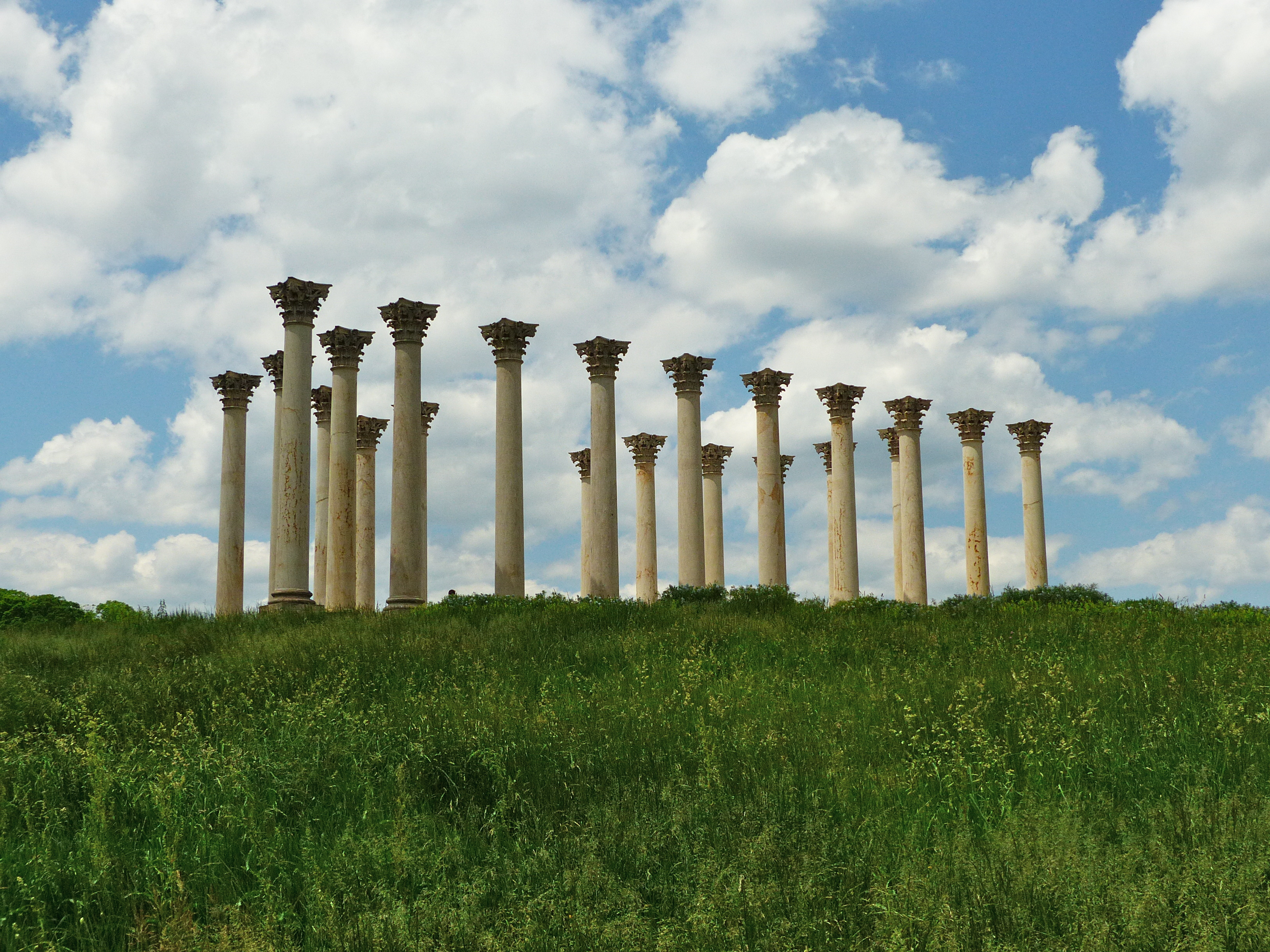 One of the first scenes to catch your eye is a series of Corinthian columns (22 to be exact) standing on a grassy hilltop, on this day against an azure sky filled with billowing clouds. These are the National Capitol Columns, once supporting the East Portico of the U.S. Capitol, removed during the Capitol expansion in 1958.