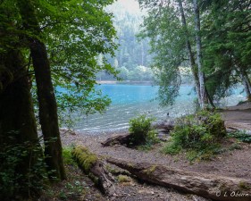 After one night in Sol Duc Valley we were on the move again, stopping at Fairholme Campground on Lake Crescent. This lovely lake is known for its brilliant teal-colored waters and extraordinary clarity, due to a lack of nitrogen in the lake that inhibits algae growth. Instruments have recorded depths in excess of 1000′, although many records reflect a maximum depth of 625′ in this glacially carved lake.